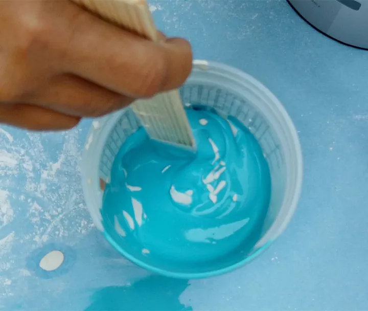 Next, let’s mix the paint! In a small container, mix ⅓ cup Plaster of Paris with ⅓ cup cool water; stir completely until smooth. You are looking for a consistency similar to pancake batter.