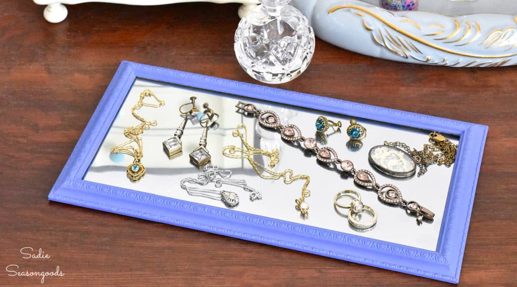 - To finish off your DIY mirrored tray, cut out a large piece of felt to glue on the underside. This will protect your dresser top from getting scratched or nicked by the back of the frame. Now your tray is ready for your favorite jewelry to be displayed!