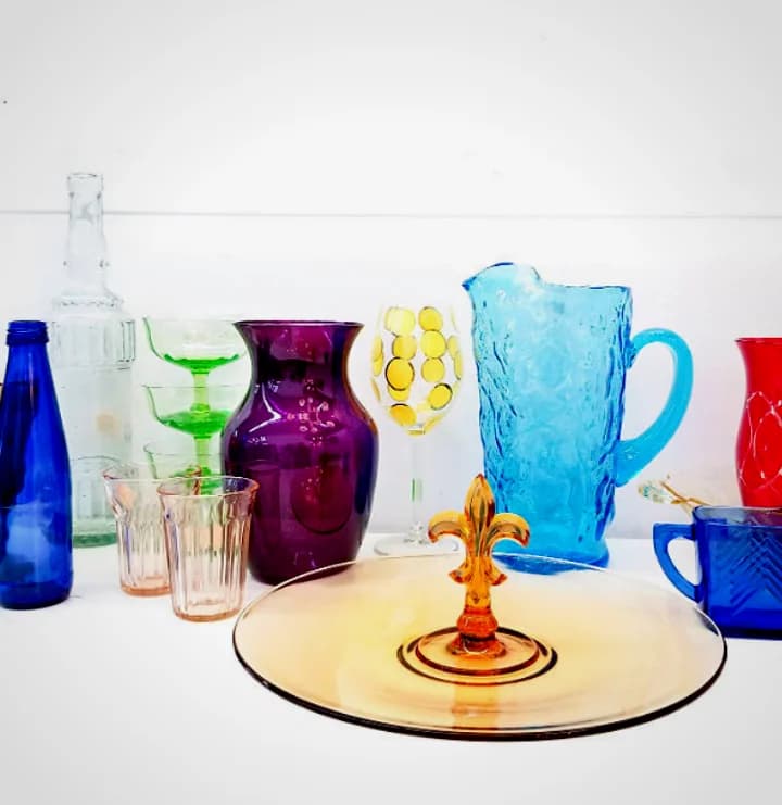 Personally, I have a weakness for colorful glass. Pitchers, vases, bottles- in every color of the rainbow. It’s such an inexpensive way to brighten a room, especially in apartments or rentals with white walls that you can’t paint!