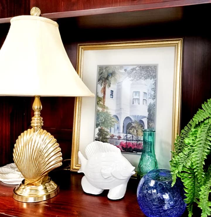 Road trips to the coast aren’t uncommon for us landlocked folks, are they? And coastal-inspired décor is an easy way to instantly feel the cool and calming style of the beach. If you look hard enough, ocean-inspired décor is a breeze at the ReStores. I gathered a seaside-inspired print from the artwork section, some green and blue glassware, and a brass seashell lamp that ALMOST went home with me.