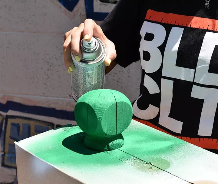 - Next, using short, sweeping bursts, cover each post with green spray paint. This is where you can be creative! Spray each one a different shade of green, or if you are feeling bold, use a bright color like pink! Allow paint to dry completely. Pro tip: For shiny cactus, use a glossy spray paint.