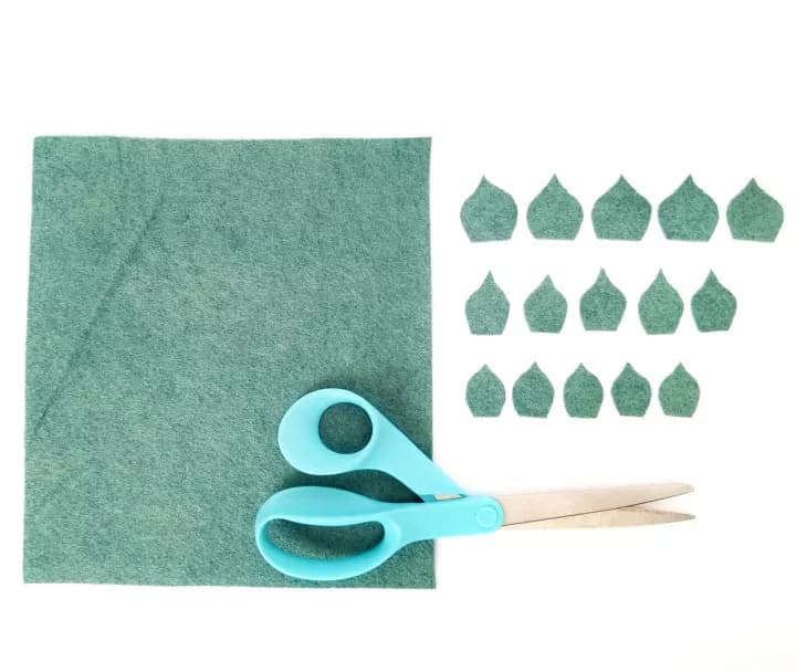 - From your felt, cut out three sets of five “leaves”. Each set should be slightly smaller than the previous one. You can make them in any shape that you want- rounded, pointy, spiky, etc. Just make sure the five leaves in each set are the exact same size.