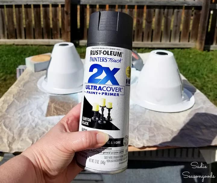 - Remove the stickers/labels and the wire spring-clips from each side. They slide out with a little bit of wiggling, trust me! Then, set up your baffles in a well-ventilated space (such as outdoors on a gorgeous Fall day) and spray paint them black.