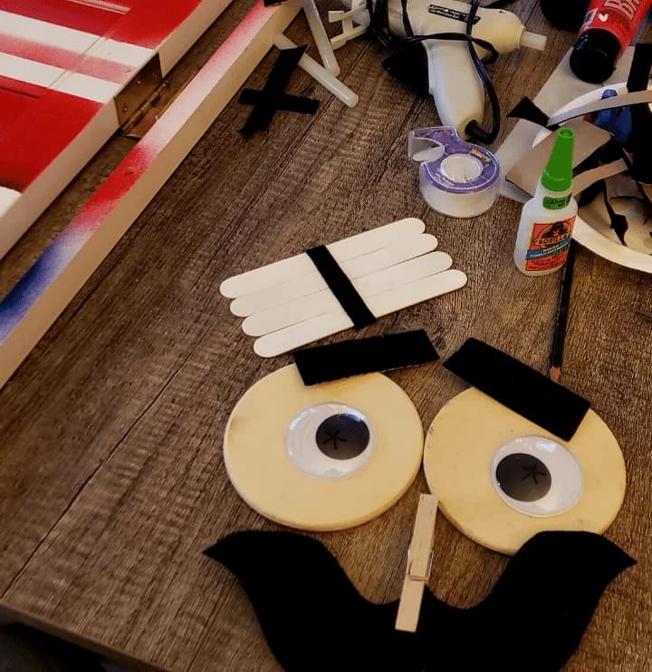 - Cut-out your mustache and eyebrows; stick your googly eyes or buttons onto the larger discs or jar lids for eyes.