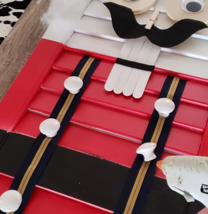 - Now that the shutter is dry, it’s time to assemble the Nutcracker! Starting at the top, find the center of the shutter and make a small mark. This will help keep your decorative elements balanced and straight. Center and glue your decorative ornament to the top of the “hat”. up with the center an authentic soldier look.
