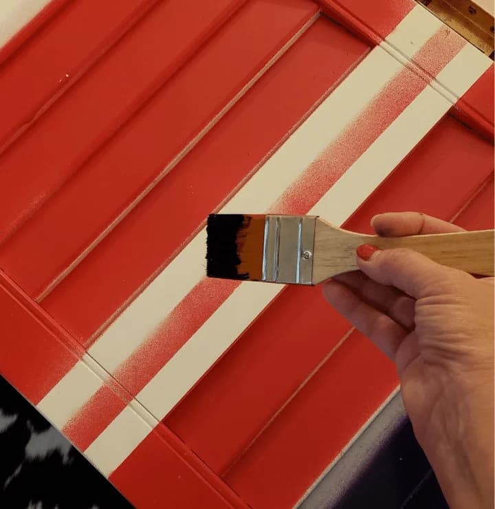 - Using short, sweeping bursts, cover the front and sides of the shutter with spray paint. Starting at the top with black, next white, then red, blue, and black. Any overspray can be covered with decoration or touched-up with acrylic paint later.